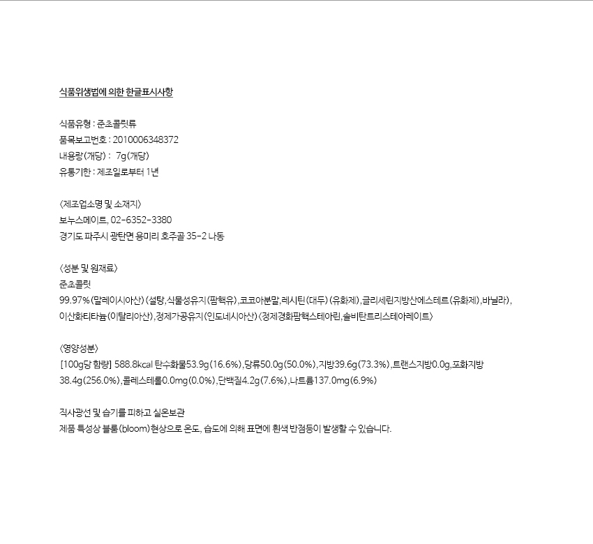 02-6352-3380 직사광선 및 습기를 피하고 실온보관. 초콜릿 특성상 온도,습도 변화에 의해 블룸(bloom)현상(표면에 원형 또는 기타 흰색 무늬가 생김)이 발생할 수 있습니다.이로인한 반품,교환은 안됩니다.